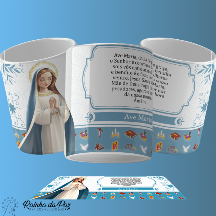 Linda Caneca Ave Maria. Ótima qualidade e um presente mais que especial para alguém que você goste, ou mesmo para se auto presentear. Nossas Canecas é confeccionada em cerâmica, personalizada por sublimação e excelente acabamento! Acompanha caixa.