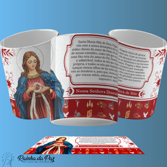 Linda caneca de Nossa Senhora Desatadora dos Nós. Ótima qualidade e um presente mais que especial para alguém que você goste, ou mesmo para se auto presentear. Nossas canecas é confeccionada em cerâmica, personalizada por sublimação e excelente acabamento! Acompanha caixa.