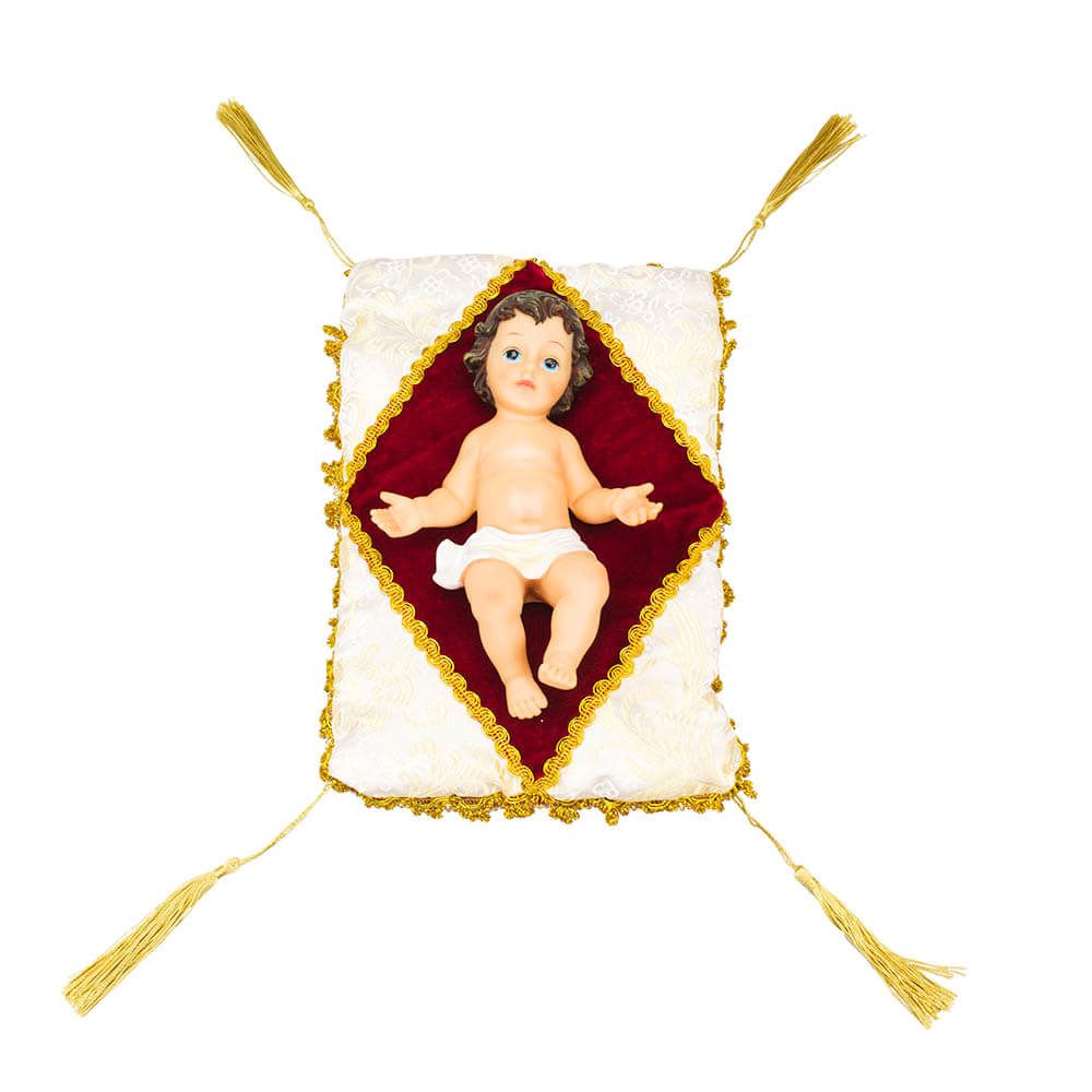 Belíssima imagem de Menino Jesus Confeccionada em Resina - 10cm, possui um alto padrão de Qualidade, com riqueza de detalhes que tornam as expressões de cada imagem mais realista. A Resina é mais resistente. Acompanha a almofada de tecido.